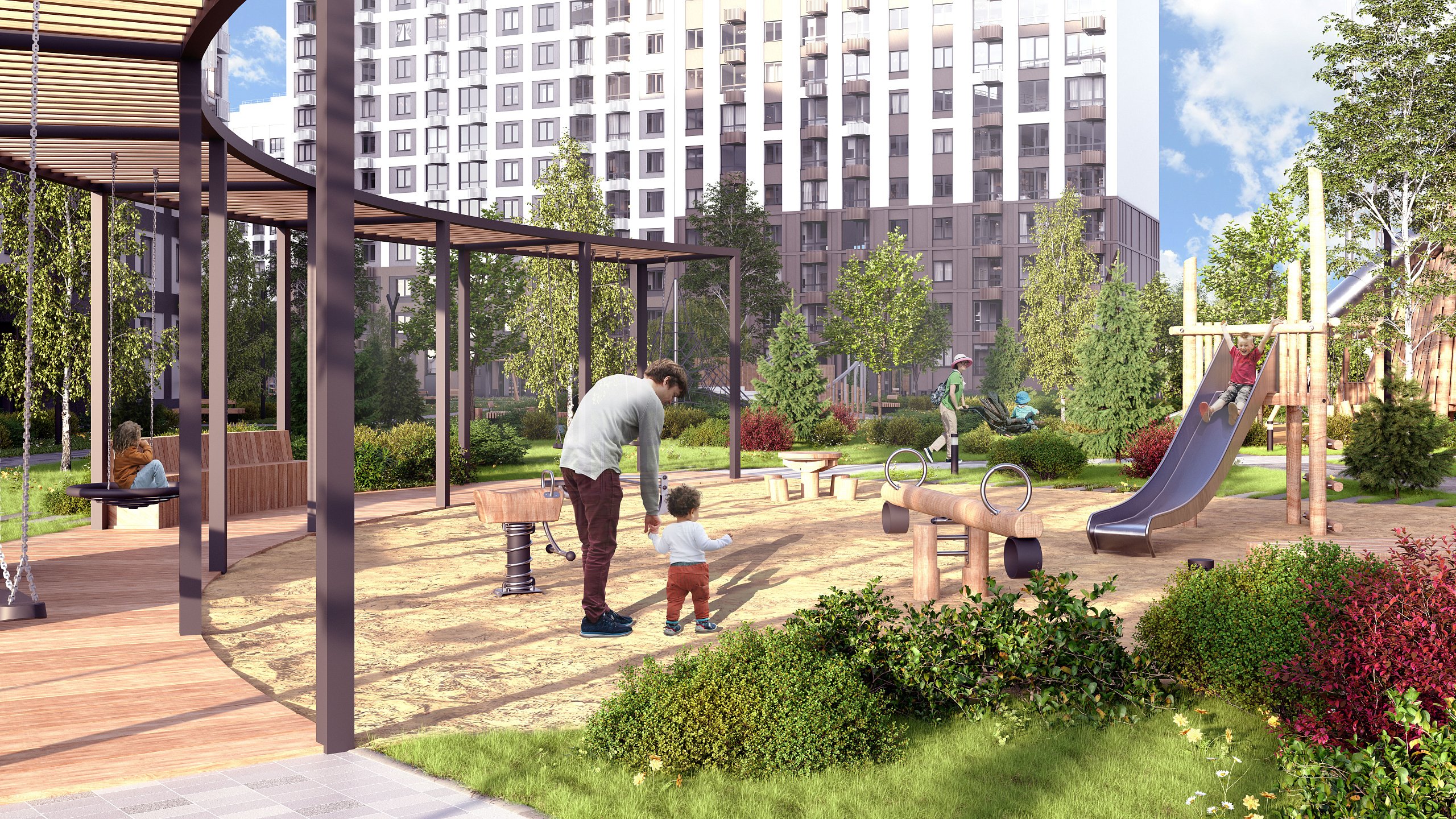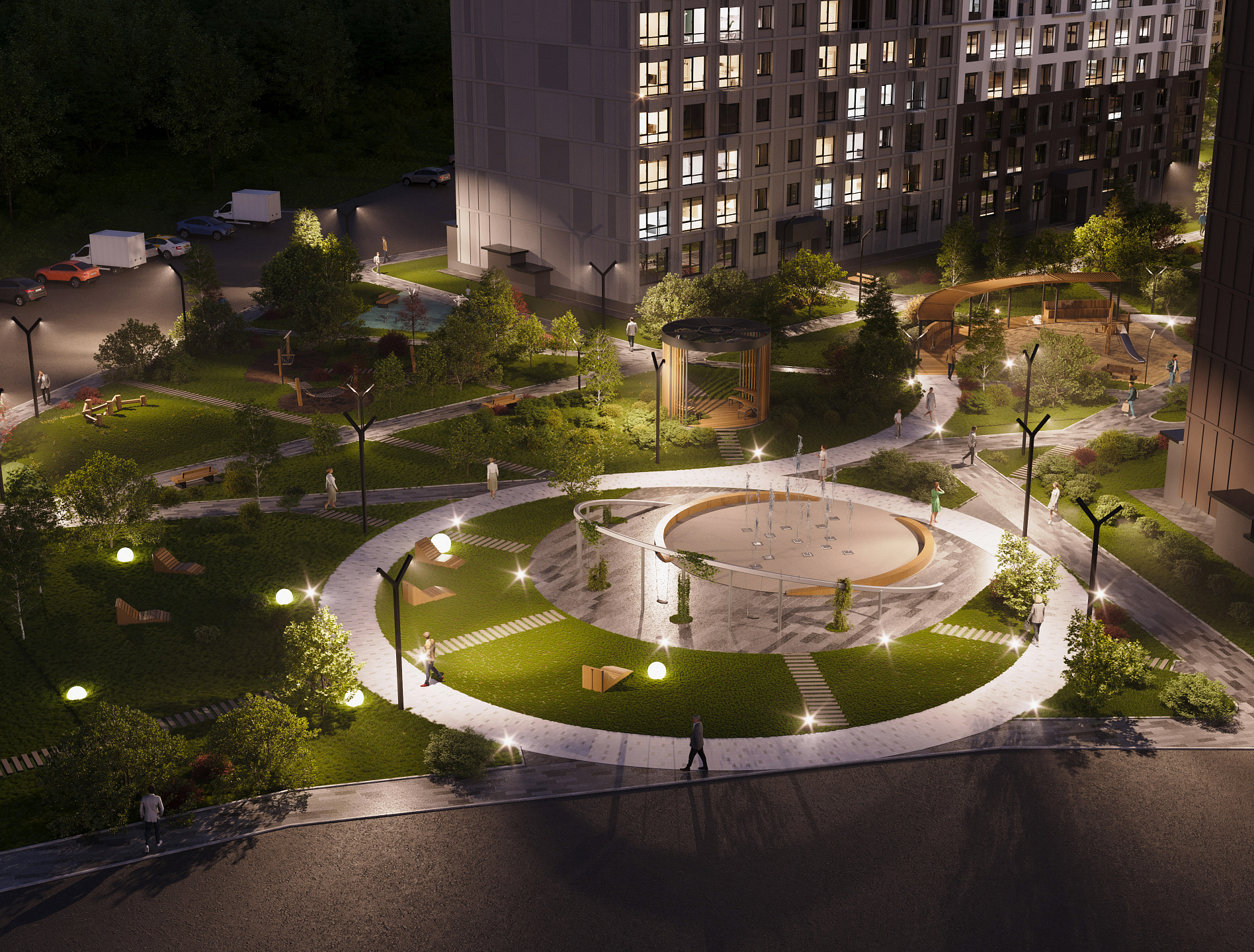 Представляем вам концепцию благоустройства территории в новой очереди квартала «ИНСТЕП.БАБЯКОВО». Это не просто двор, а настоящий сценарий для прогулок и отдыха, вдохновленный миром кино. Всё начинается с площади, по своей форме напоминающей катушку кинопленки, где установлен сухой фонтан с качелями. Это эффектное начало аллеи, которая извилистой дорожкой будет проходить через весь двор, объединяя между собой различные функциональные зоны.