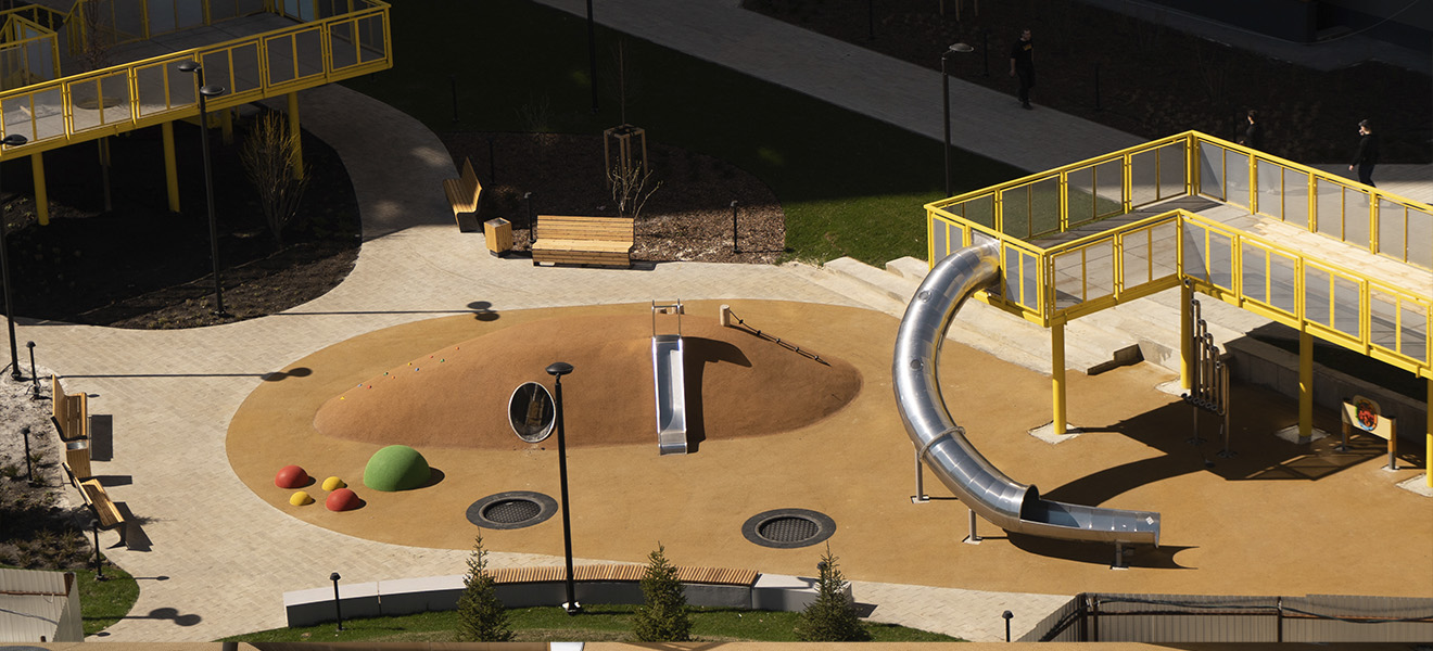 В основе проекта — идея гармоничного сочетания индустриальной эстетики и природной среды. Металлические малые архитектурные формы с выразительными желтыми акцентами подчеркивают характер места, а продуманное озеленение из многолетних трав, кустарников и деревьев создает комфортное и живое пространство для отдыха и повседневной жизни.
