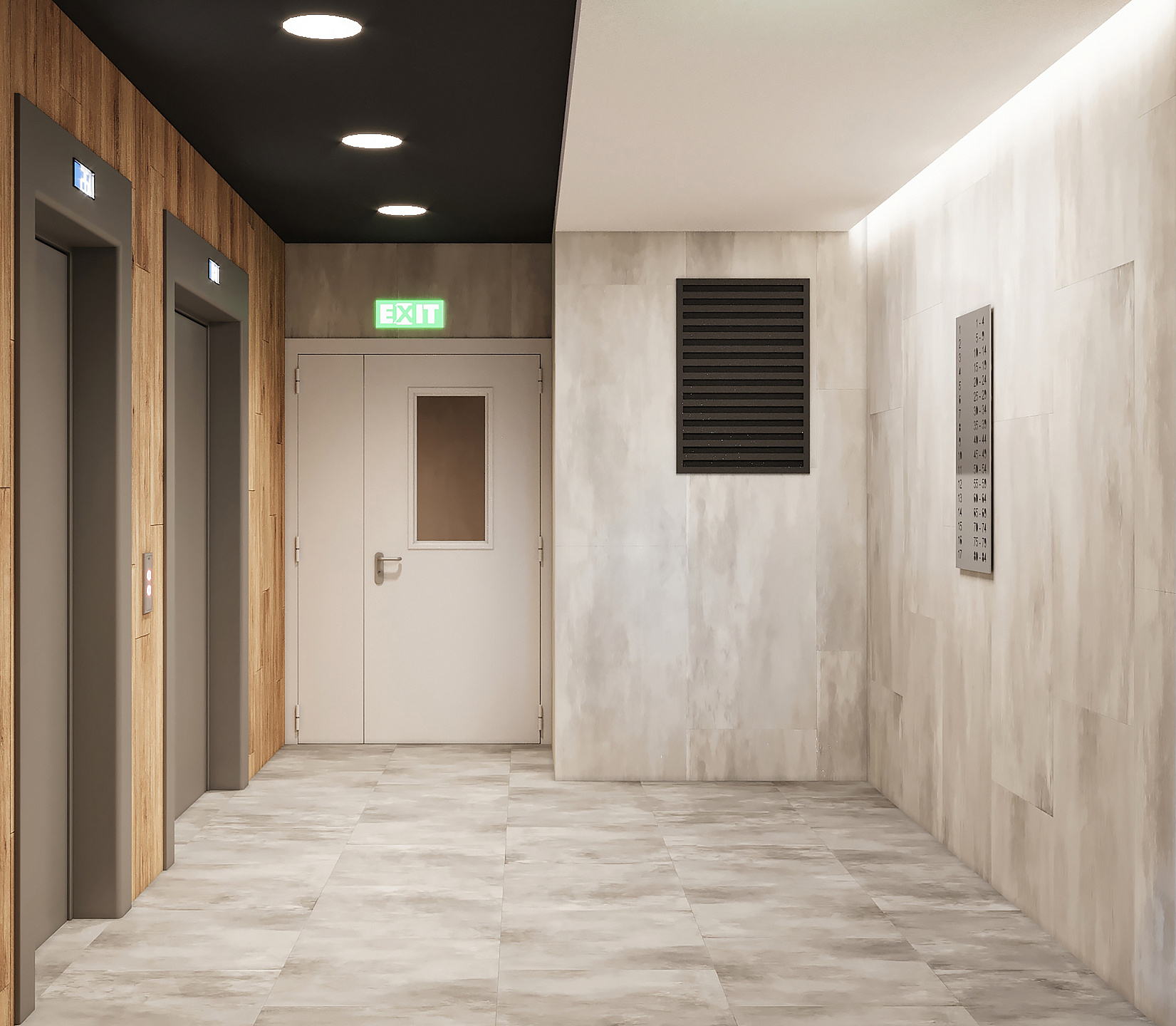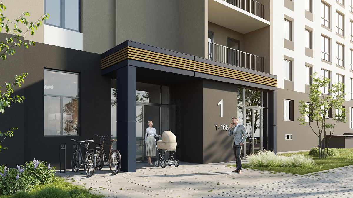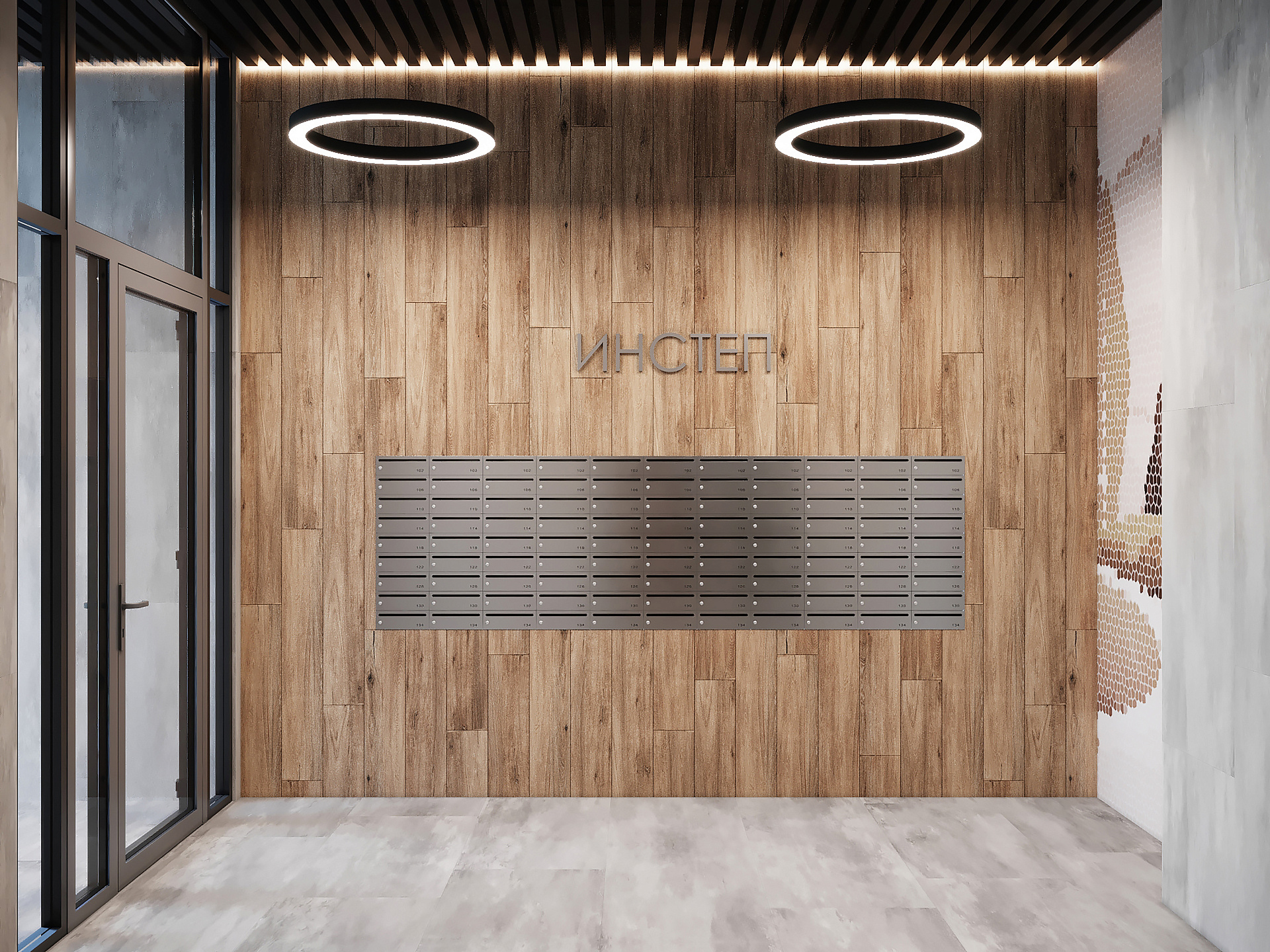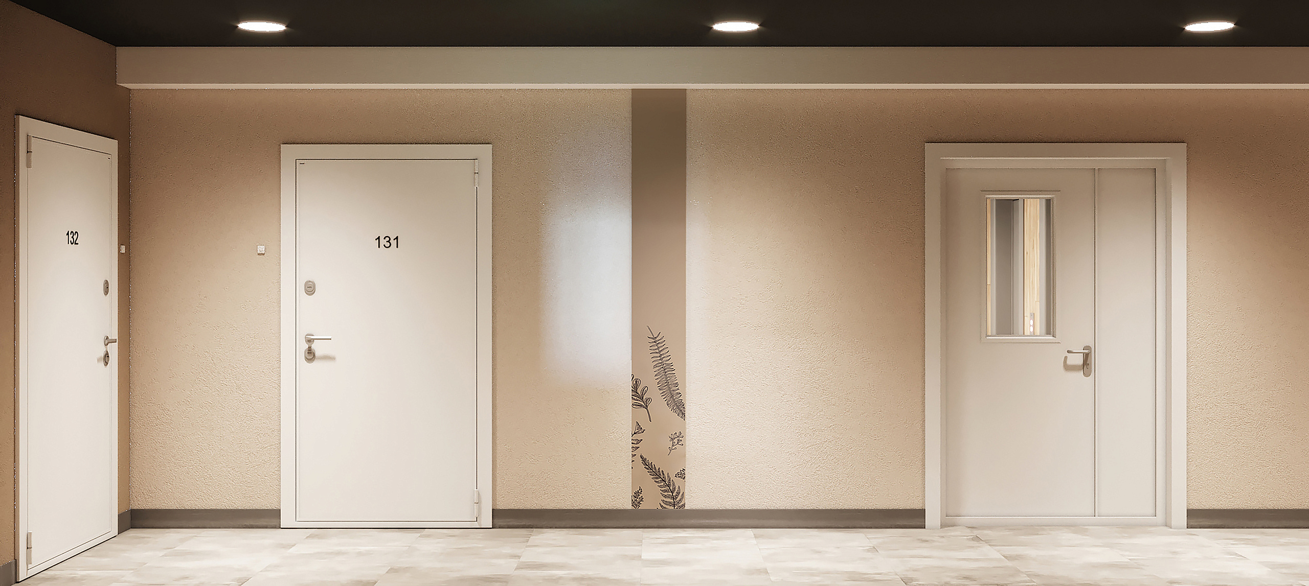 Межквартирные холлы и подъезды будут отделаны по специально разработанному дизайн-проекту. Для поддержания концепции жилого комплекса будут использованы природные материалы, крупноформатный керамогранит, панорамное остекление, наполняющее помещение светом, а также стильные светильники и люстры. Витражи и входные двери на первом этаже выполнены из алюминия.