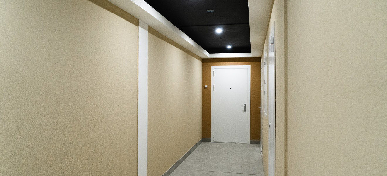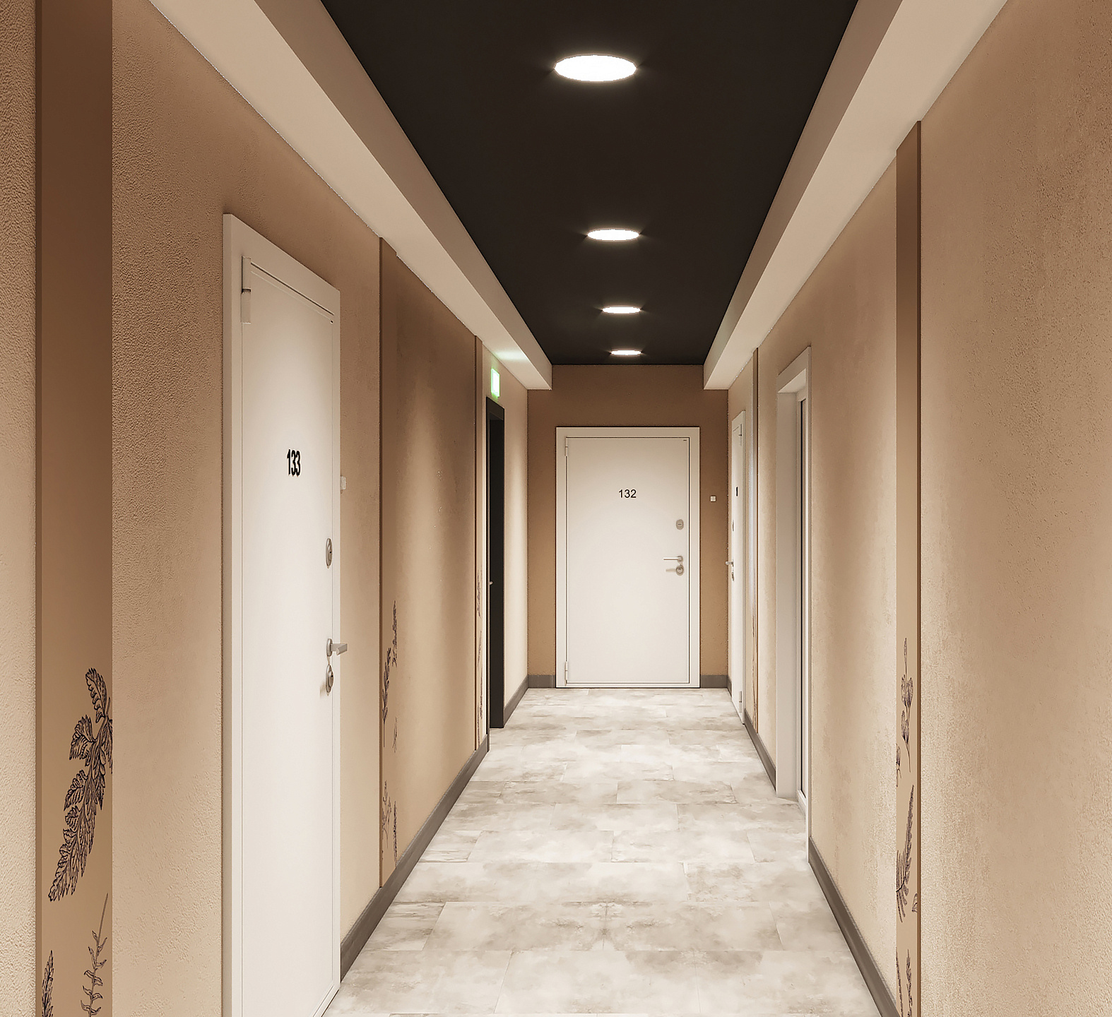 В межквартирных коридорах на пол будет уложен светло-бежевый керамогранит. Для отделки стен применяется декоративная штукатурка бежевого и карамельного оттенков, в сочетании с акцентными обоями с растительным принтом. На потолке установлены точечные светильники, а сам потолок выкрашен в темно серый цвет. Также под потолком смонтированы белые фальш-карнизы, которые скрывают провода и визуально увеличивают пространство.