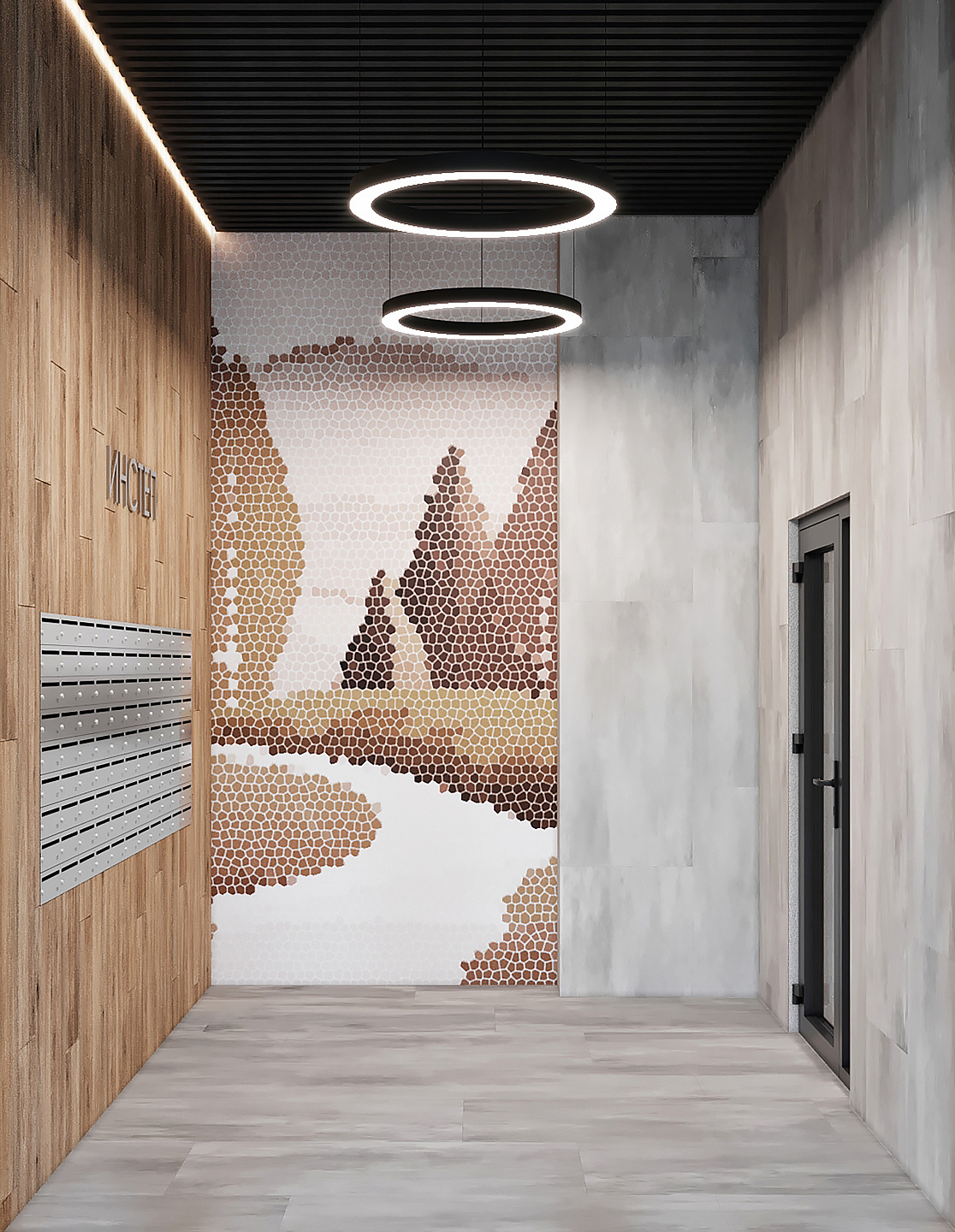 Концепция безбарьерной среды – проход до лифта на уровне земли, без ступенек – будет оценена родителями с колясками и людьми с ограниченной мобильностью. В холле первого этажа для напольных покрытий и отделки стен используется светло серый керамогранит, керамогранит «под дерево». Стены будут украшены мозаикой с мотивами русских пейзажей и русской природы. Смонтирован подвесной реечный потолок темного цвета с подвесными светильниками.