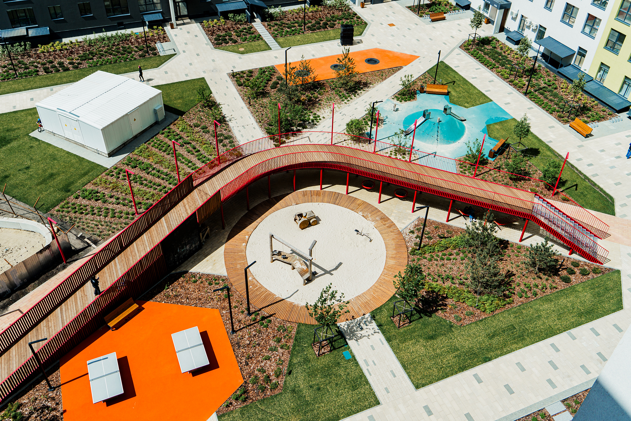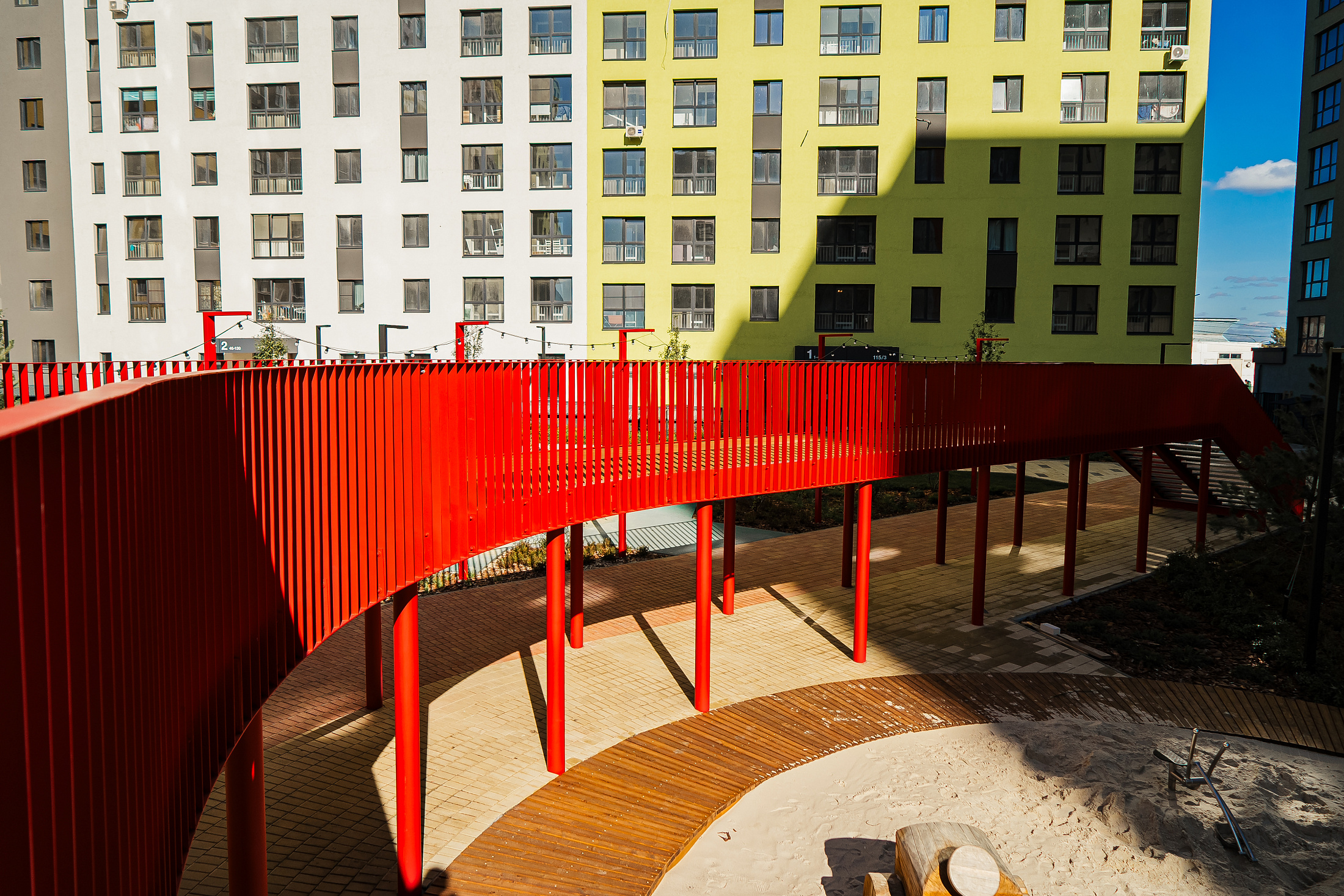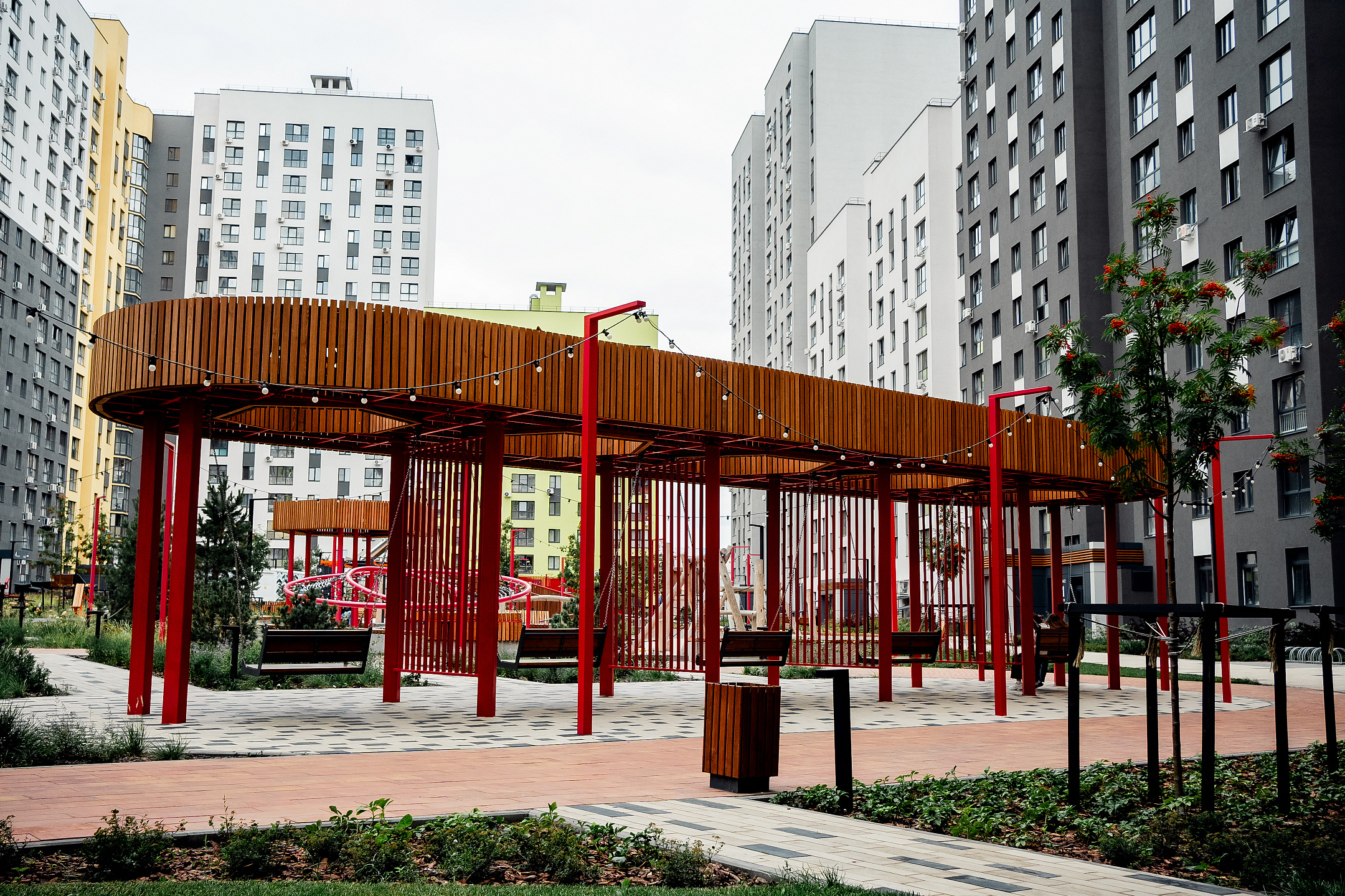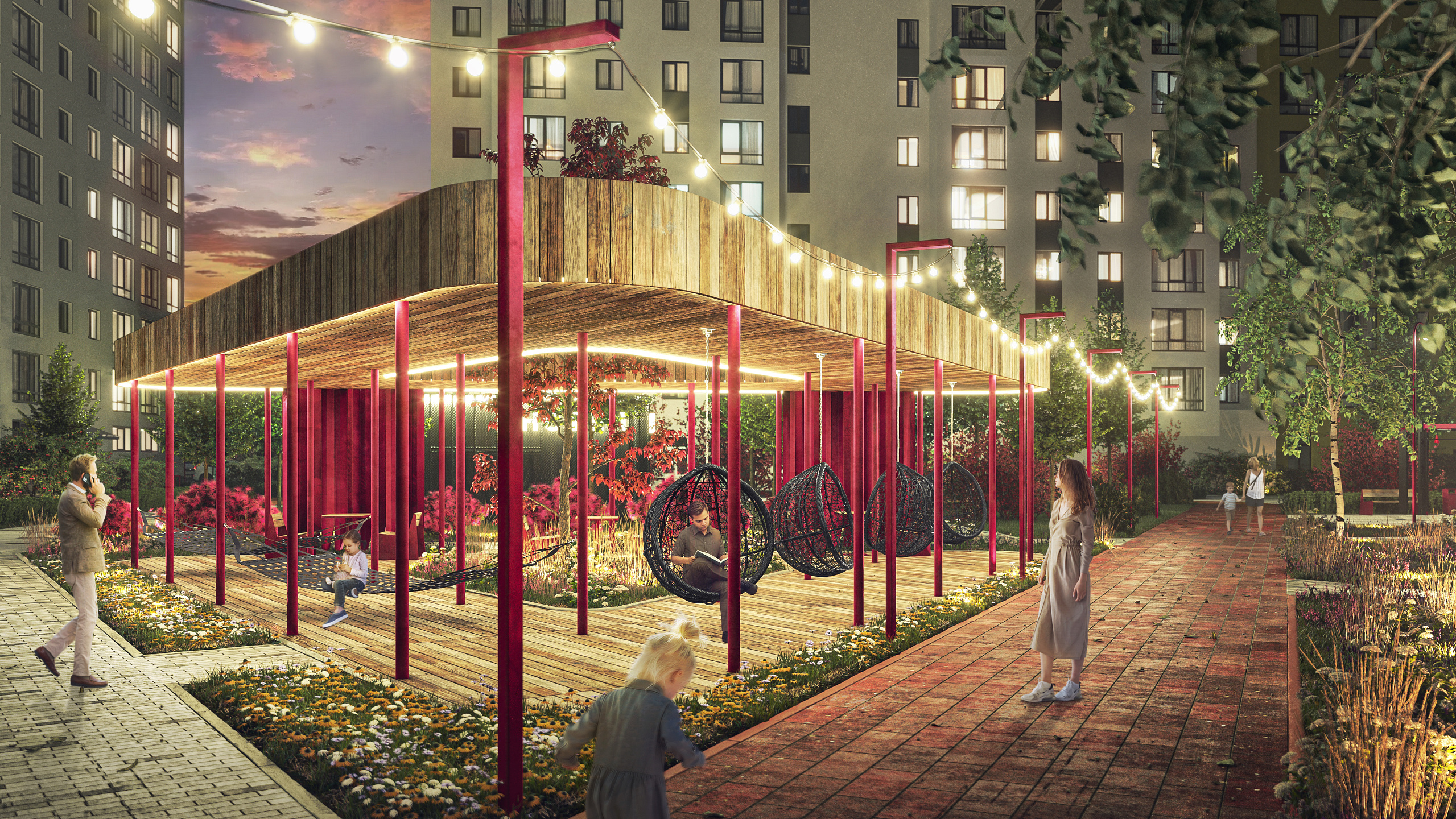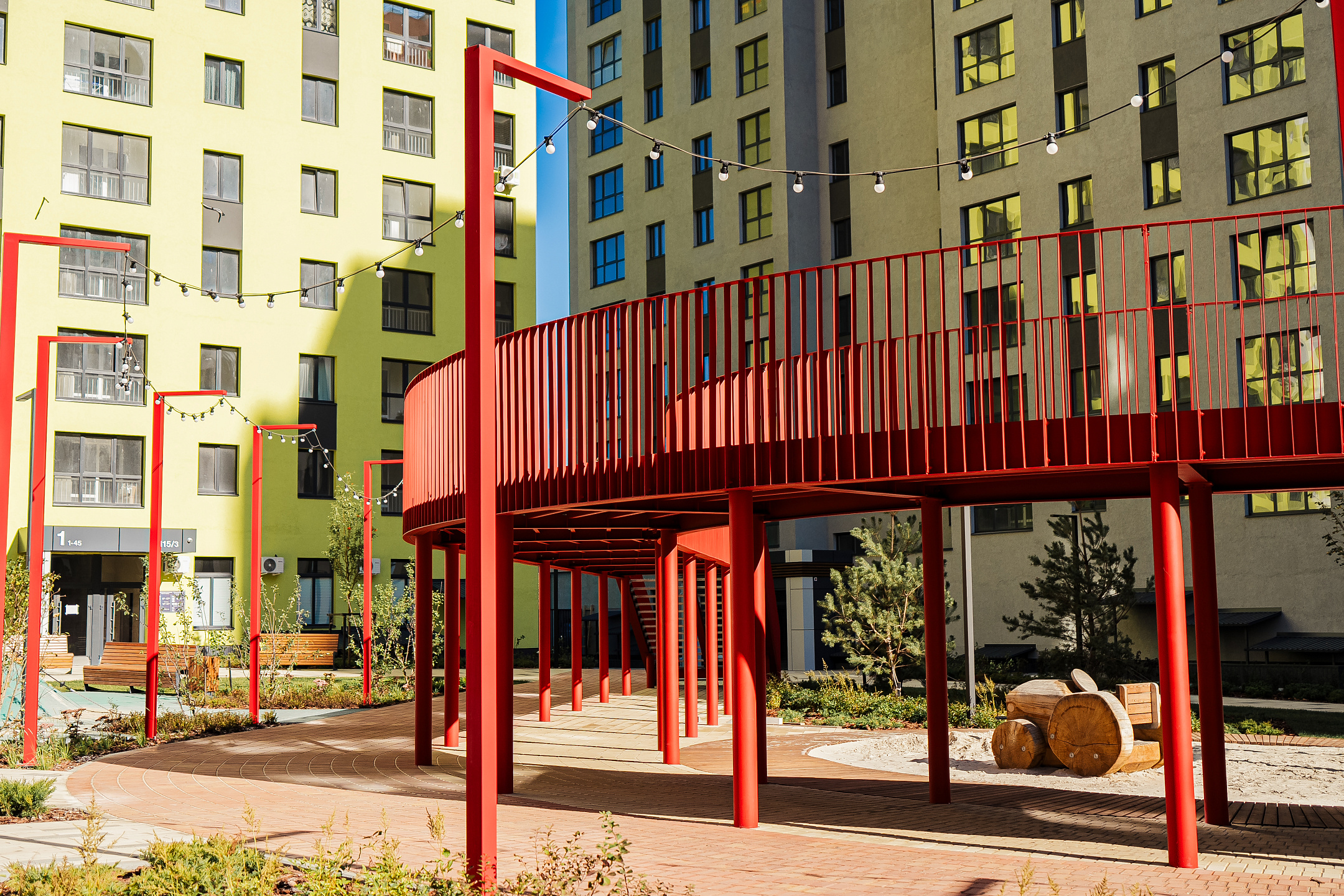 Территория ЖК включает большое количество элементов, напоминающих детали и запчасти различных механизмов. Озеленение, уникальное оборудование, беседки и малые архитектурные формы - все подчеркивает идентичность места. Подробнее в презентации.