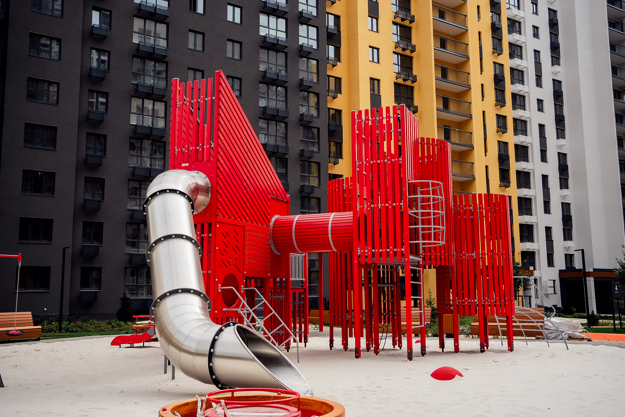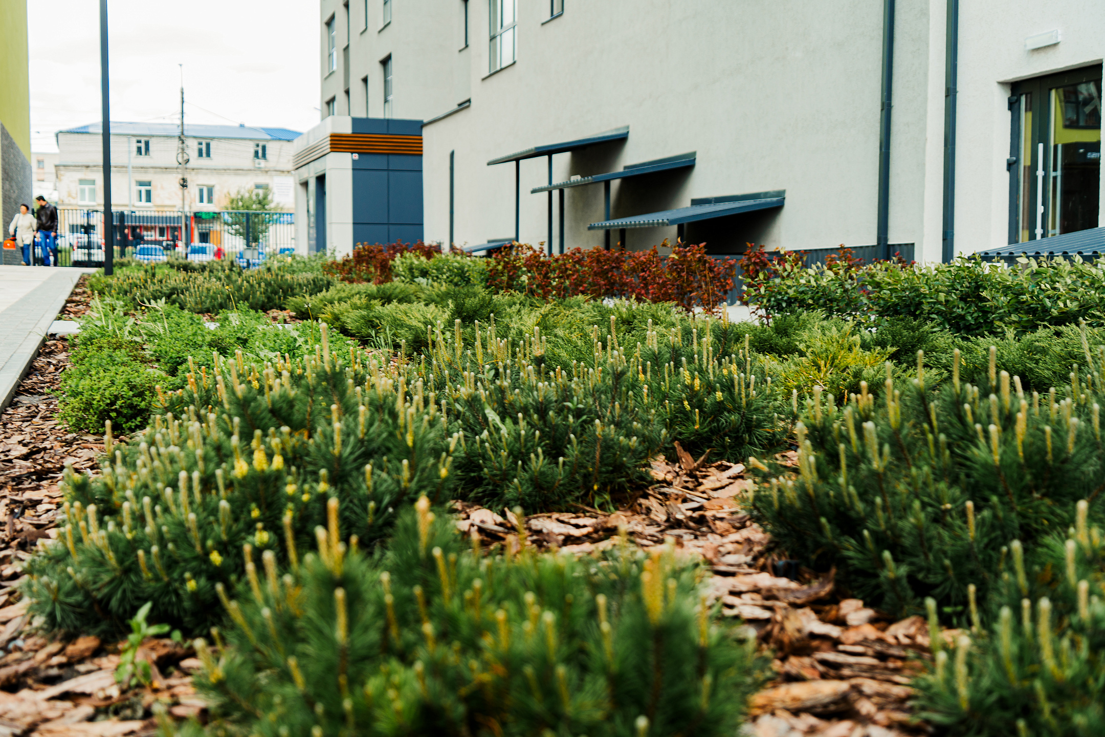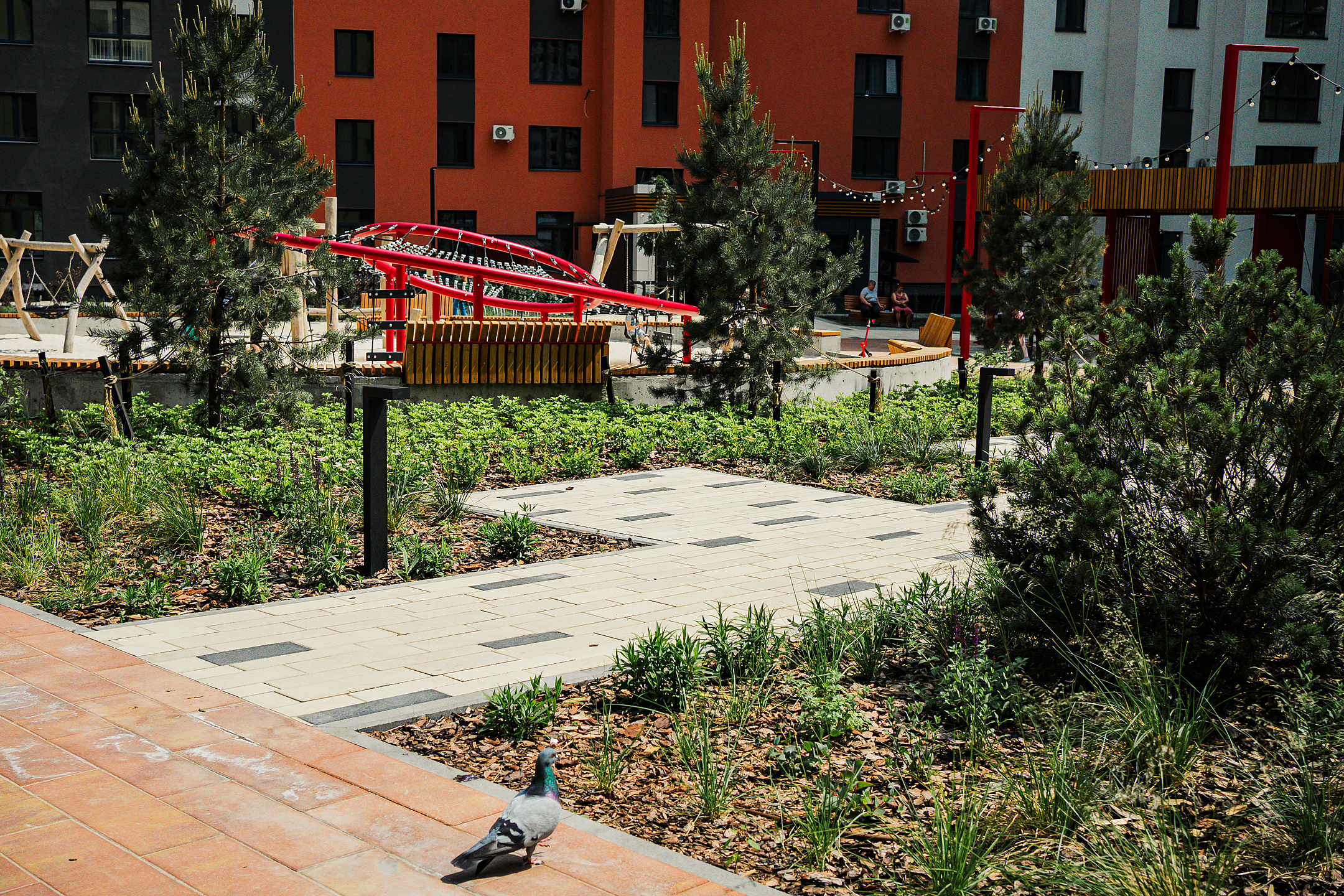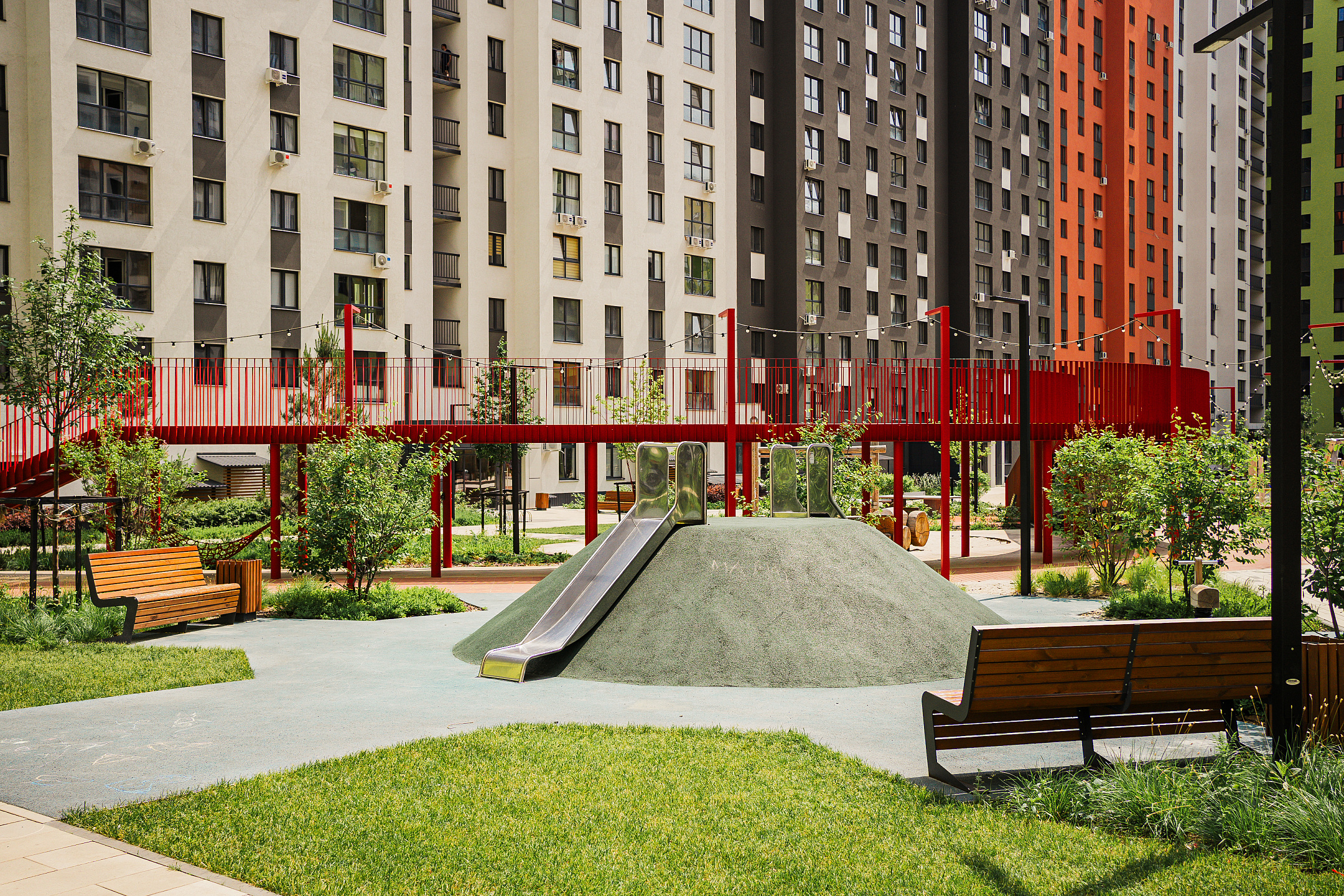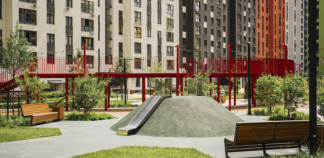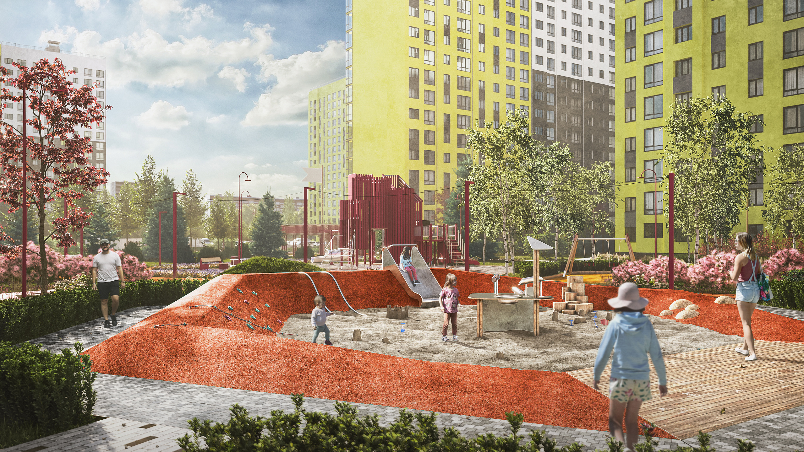 Территория ЖК включает большое количество элементов, напоминающих детали и запчасти различных механизмов. Озеленение, уникальное оборудование, беседки и малые архитектурные формы - все подчеркивает идентичность места. Подробнее в презентации.