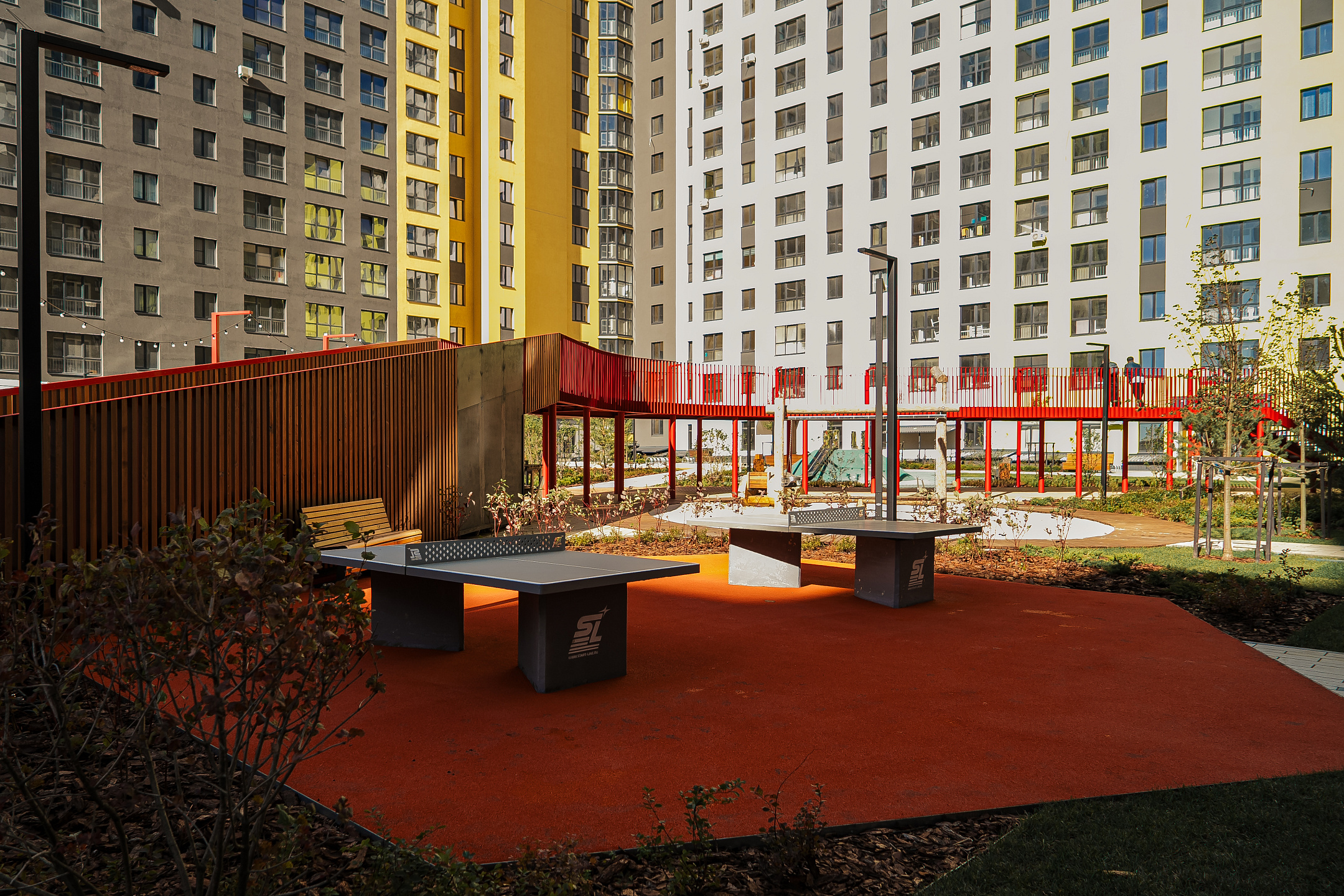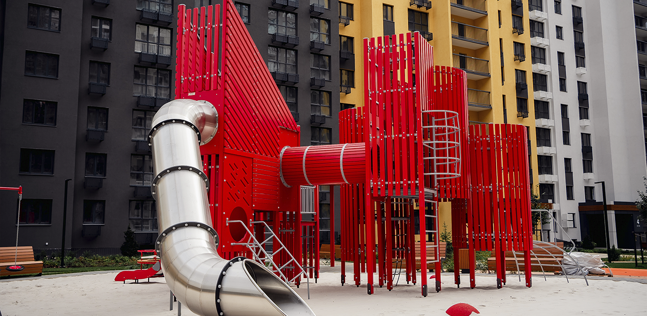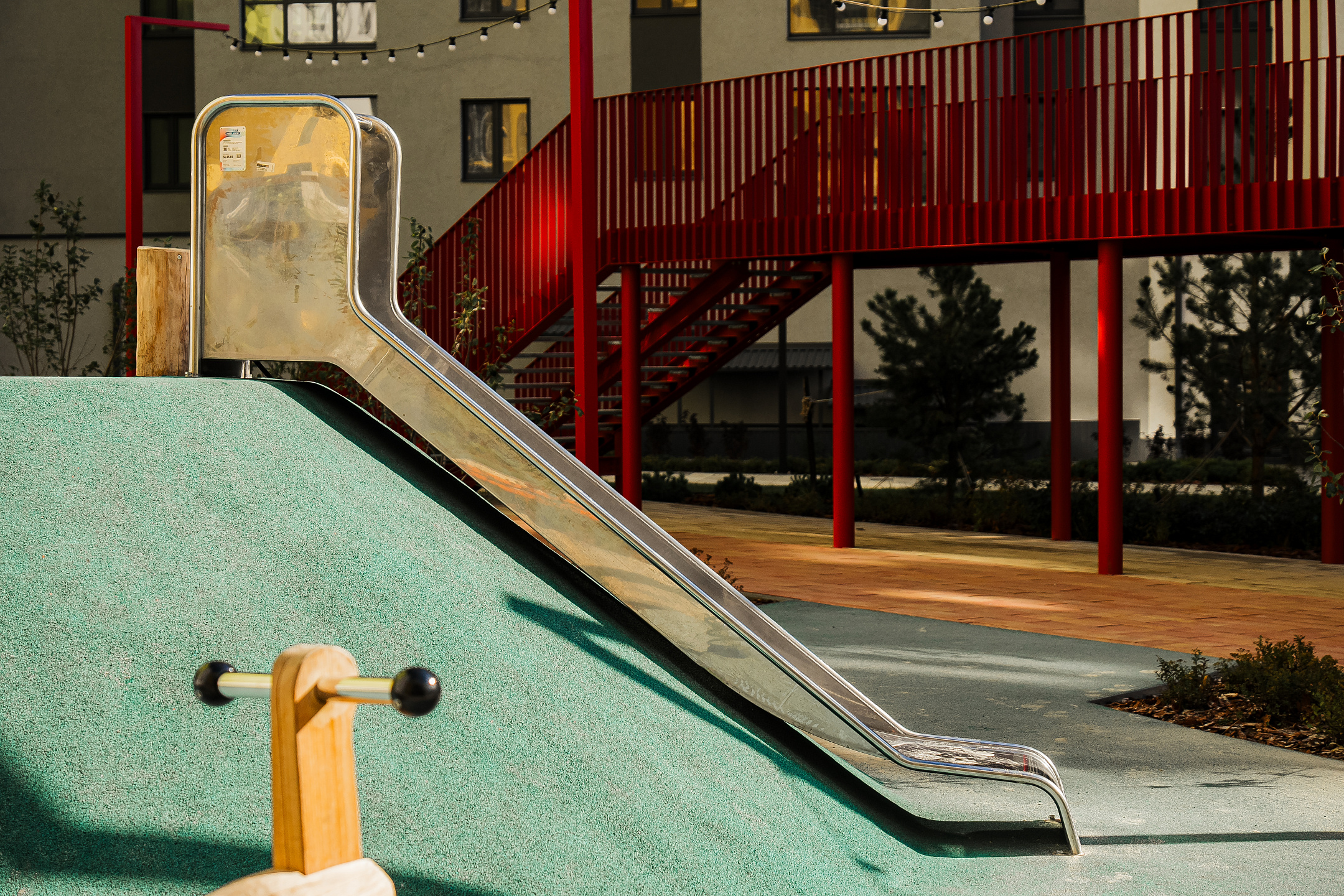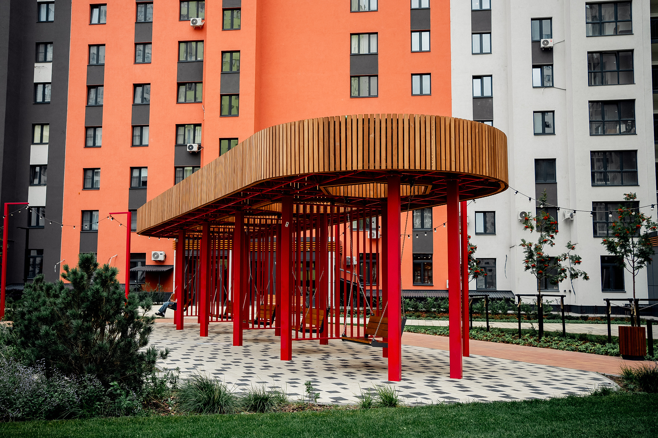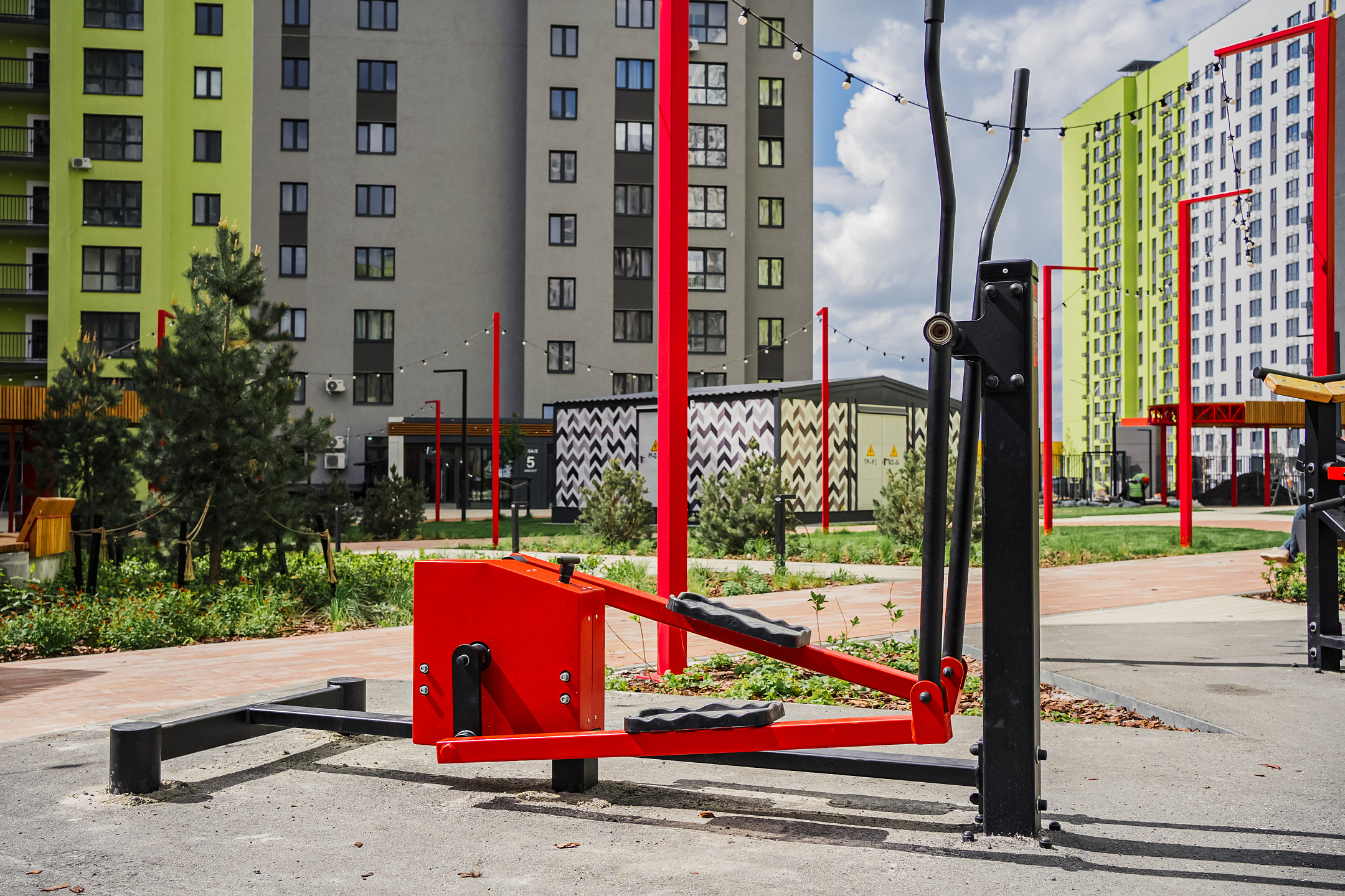Территория ЖК включает большое количество элементов, напоминающих детали и запчасти различных механизмов. Озеленение, уникальное оборудование, беседки и малые архитектурные формы - все подчеркивает идентичность места. Подробнее в презентации.